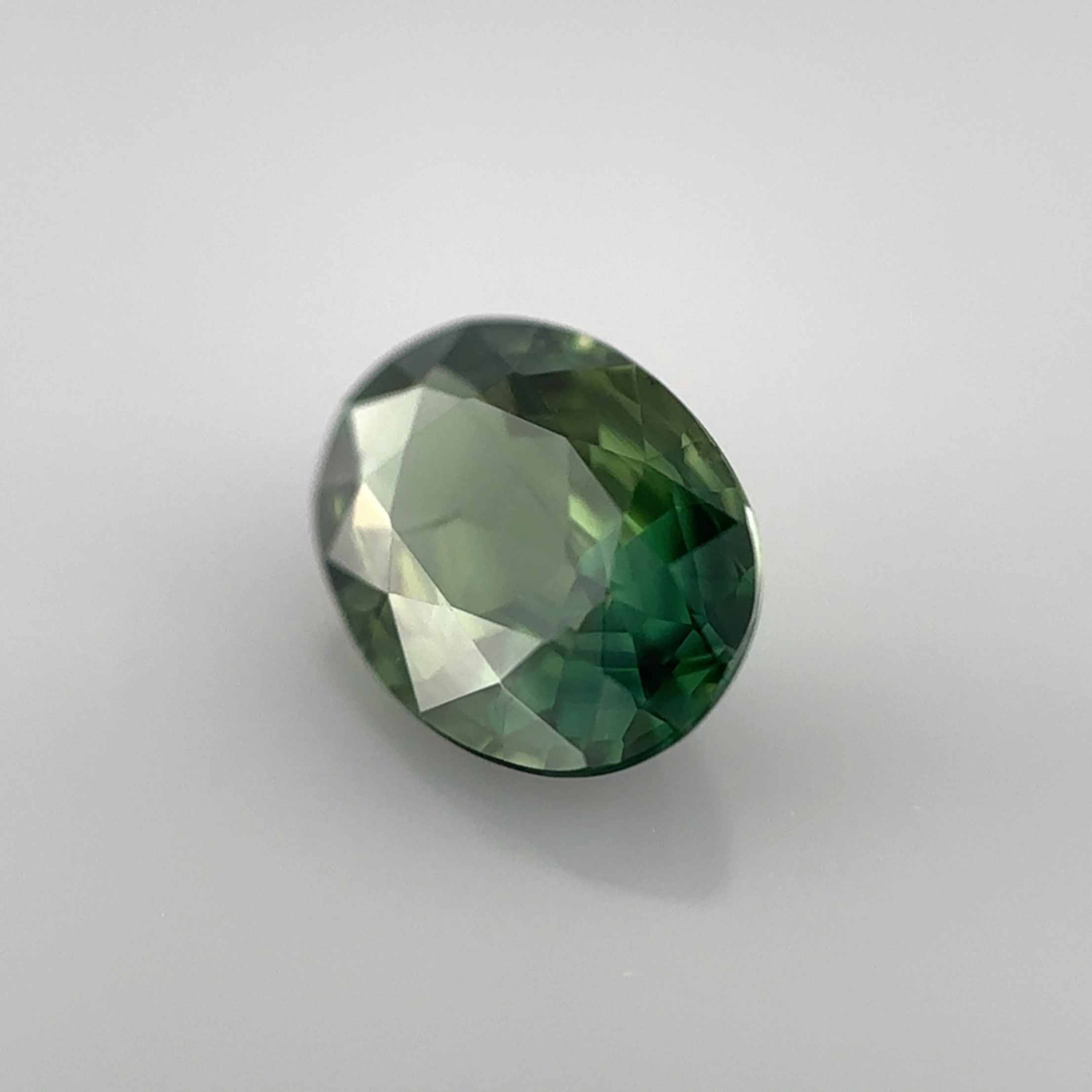Voici un saphir vert oval issu des plus beaux gisements basaltiques de pierres précieuses. On aime sa couleur intense.