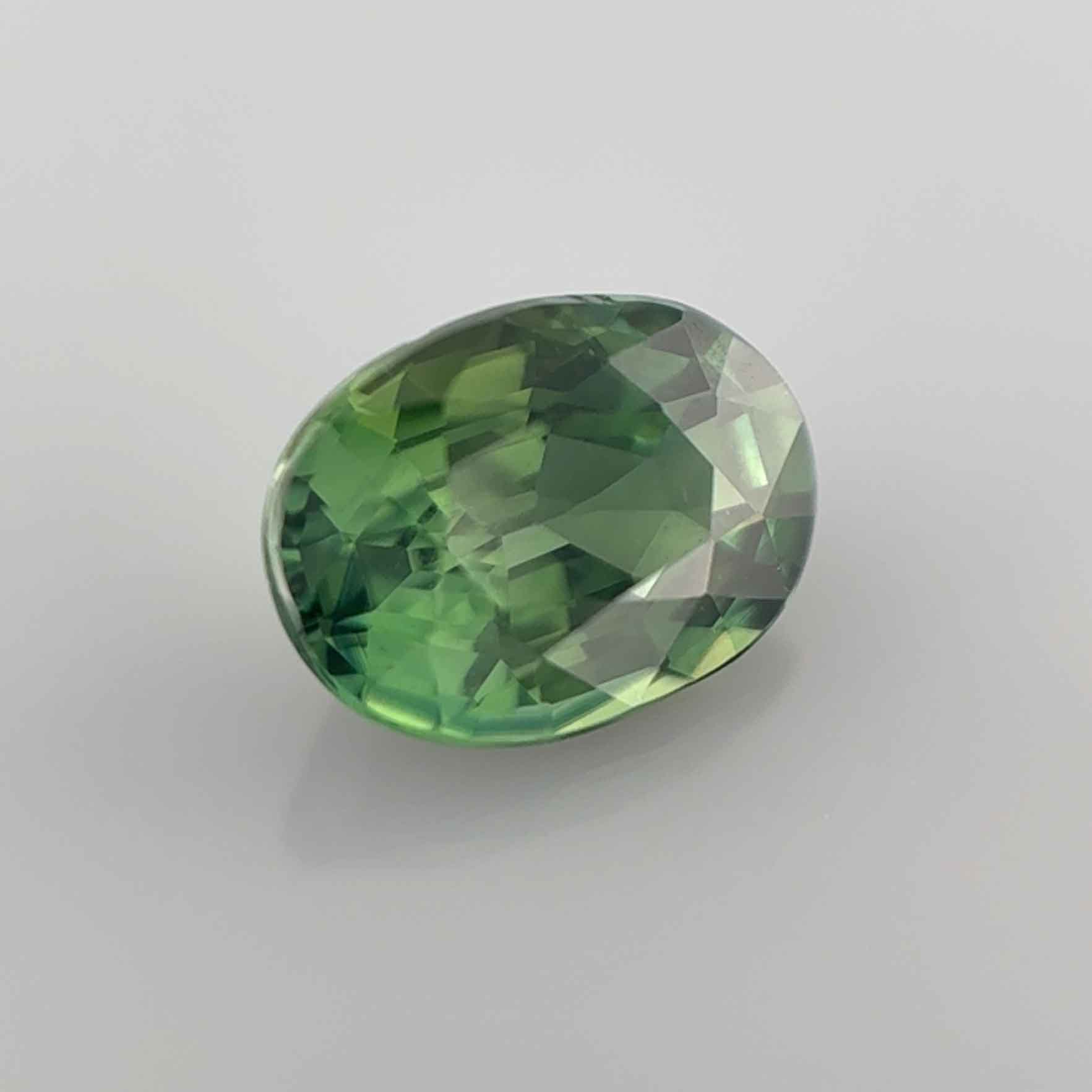 Voici un saphir vert oval issu des plus beaux gisements basaltiques de pierres précieuses. On aime sa couleur intense.